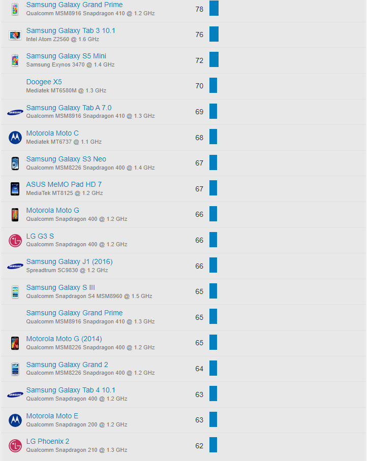 | 713 | Motorola Moto E | Qualcomm Snapdragon 200 @ 1.2 GHz | 63 |