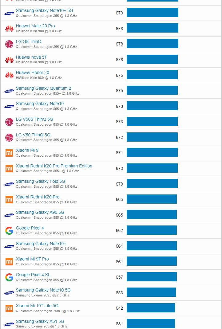 | 70 | Huawei Honor V30 Pro | HiSilicon Kirin 990 @ 2.0 GHz | 757 |