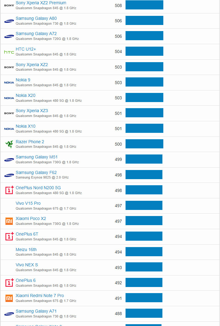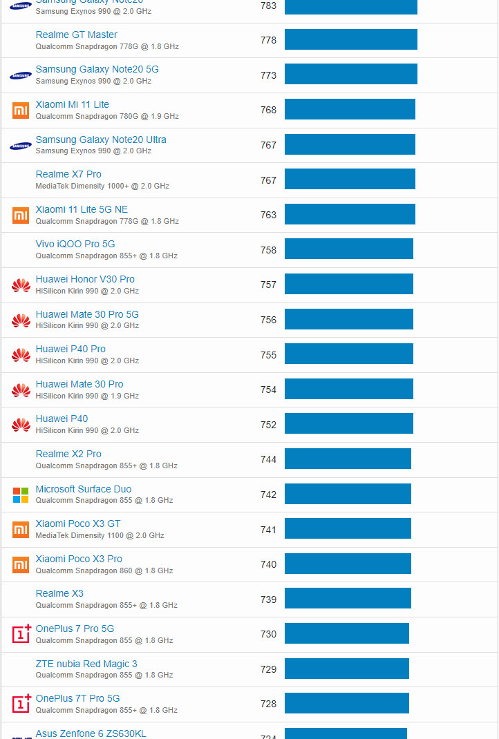 | 79 | Realme X3 | Qualcomm Snapdragon 855+ @ 1.8 GHz | 739 |