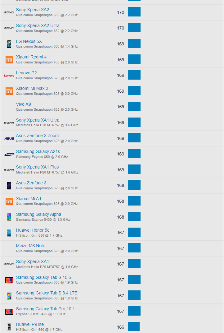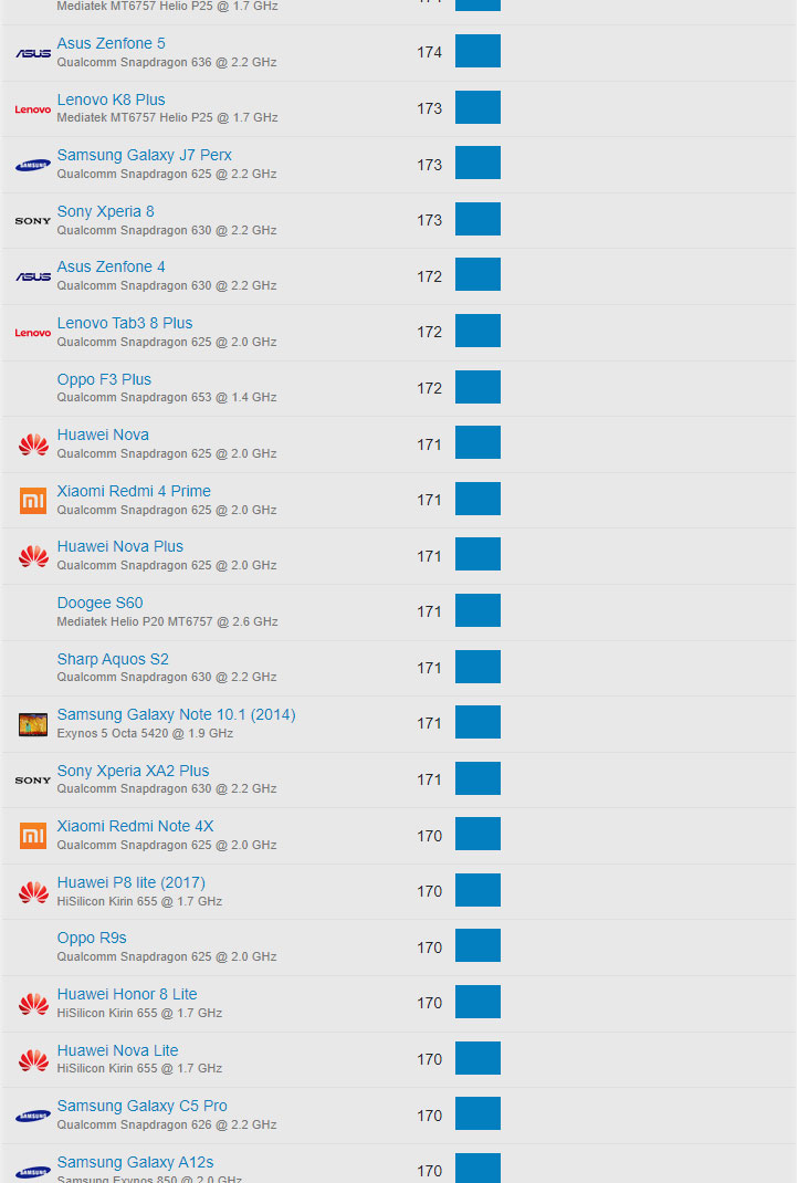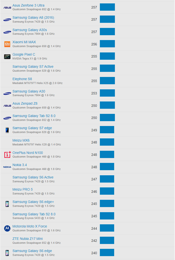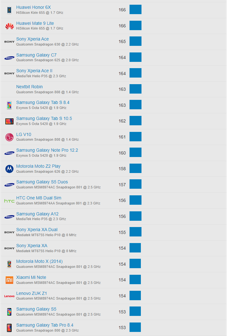 | 644 | Huawei Honor 6A | Qualcomm Snapdragon 430 @ 1.4 GHz | 105 |