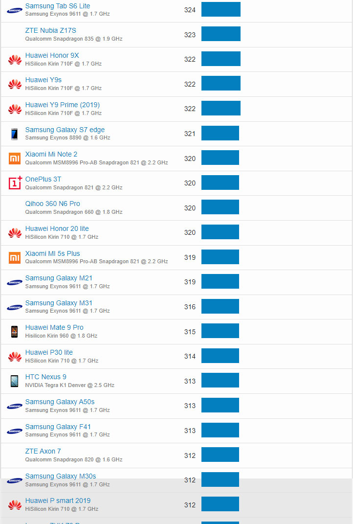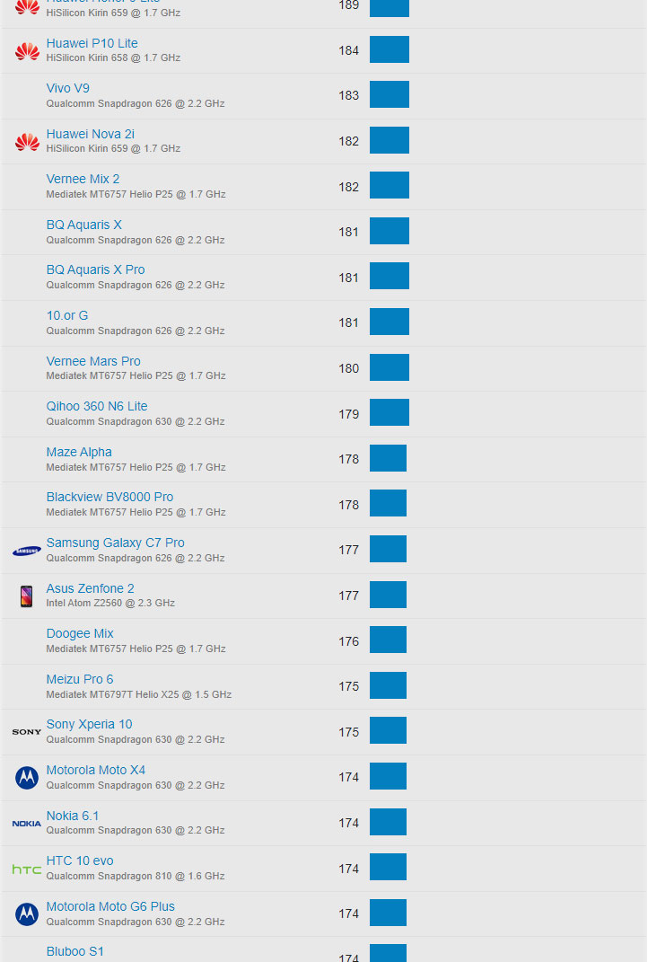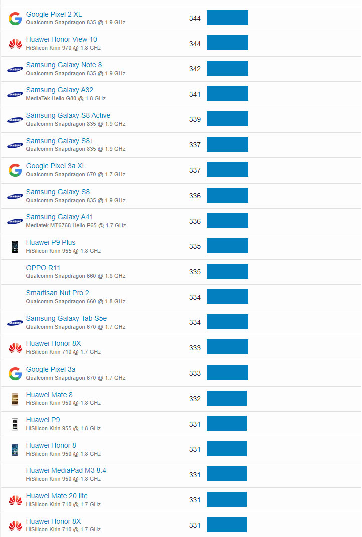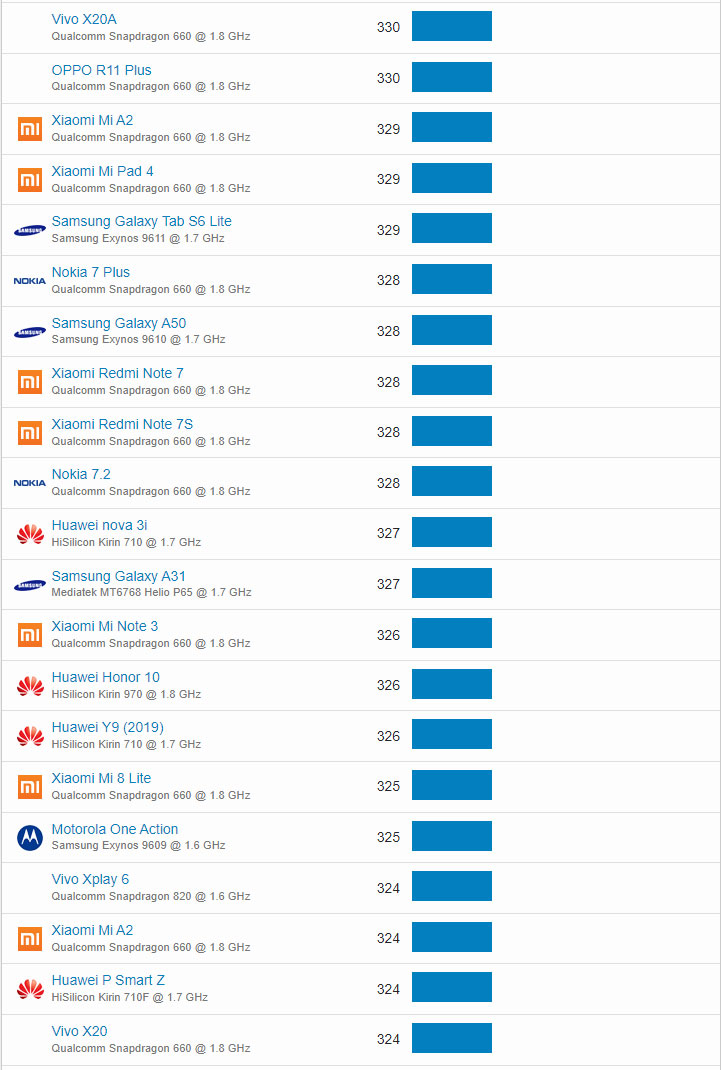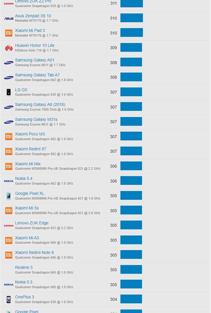 | 644 | Huawei Honor 6A | Qualcomm Snapdragon 430 @ 1.4 GHz | 105 |