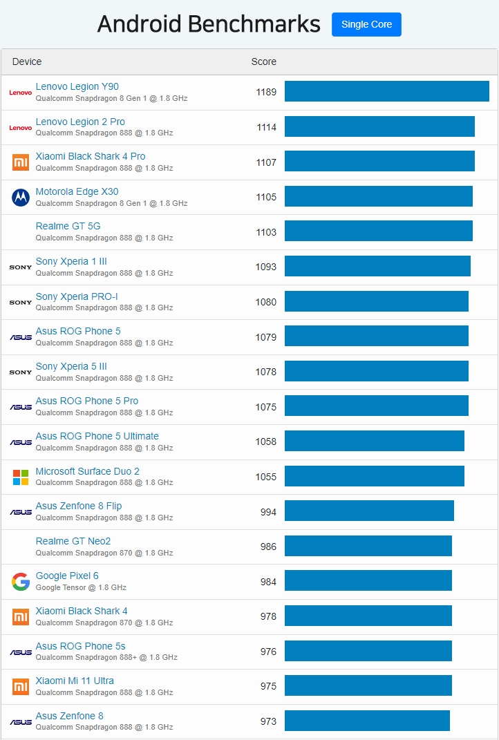 | 1 | Lenovo Legion Y90 | Qualcomm Snapdragon 8 Gen 1 @ 1.8 GHz | 1189 |
