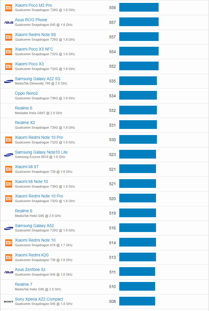 | 54 | Xiaomi Mi 11X | Qualcomm Snapdragon 870 @ 1.8 GHz | 857 |