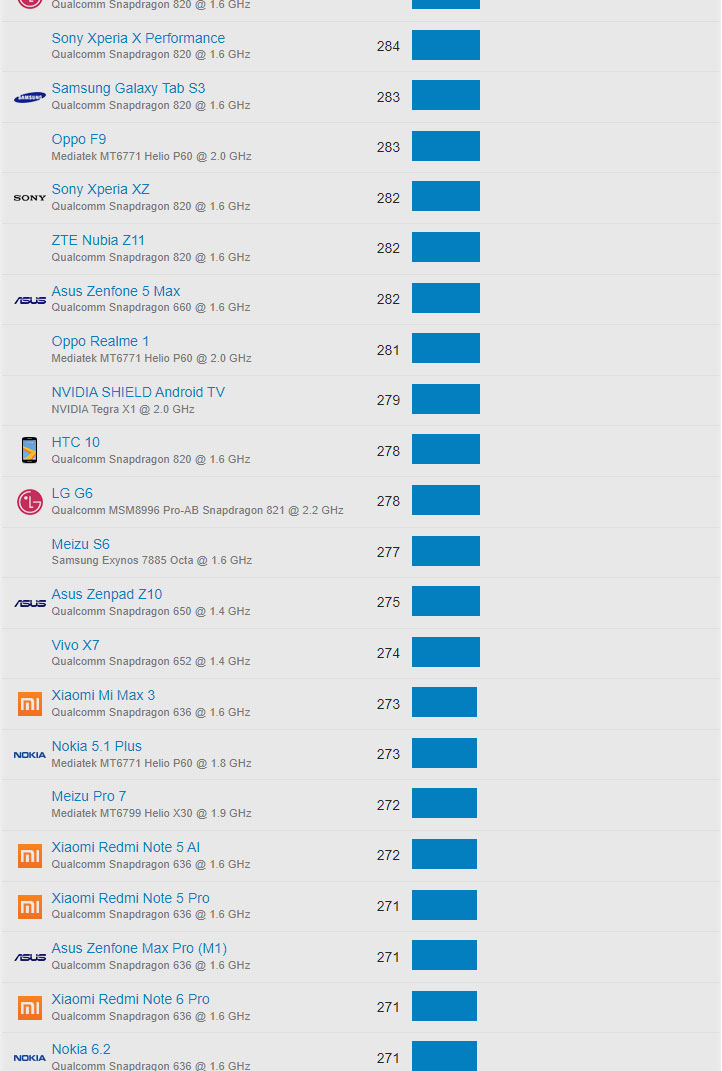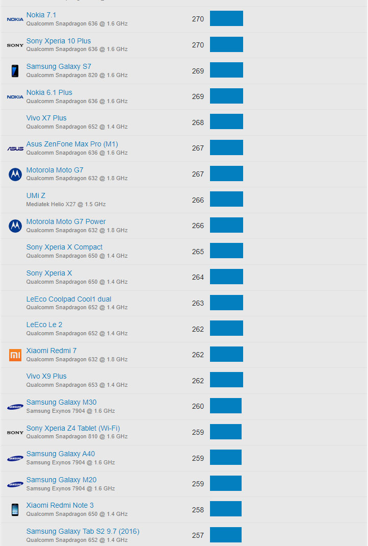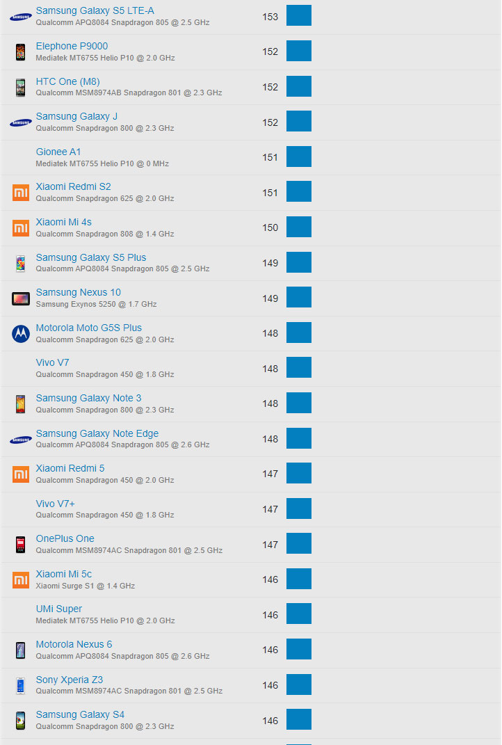 | 641 | Motorola Moto G5S | Qualcomm Snapdragon 430 @ 1.4 GHz | 105 |
