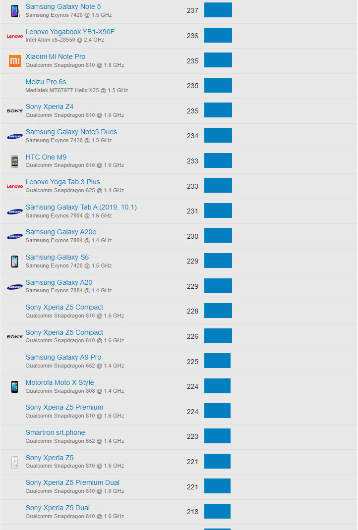 | 626 | Samsung Galaxy J7 (2016) | Qualcomm Snapdragon 617 @ 1.6 GHz | 114 |