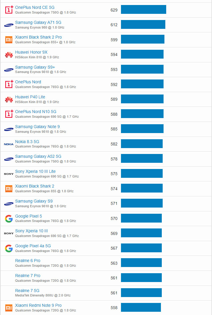 | 29 | OnePlus 9R | Qualcomm Snapdragon 870 @ 1.8 GHz | 940 |