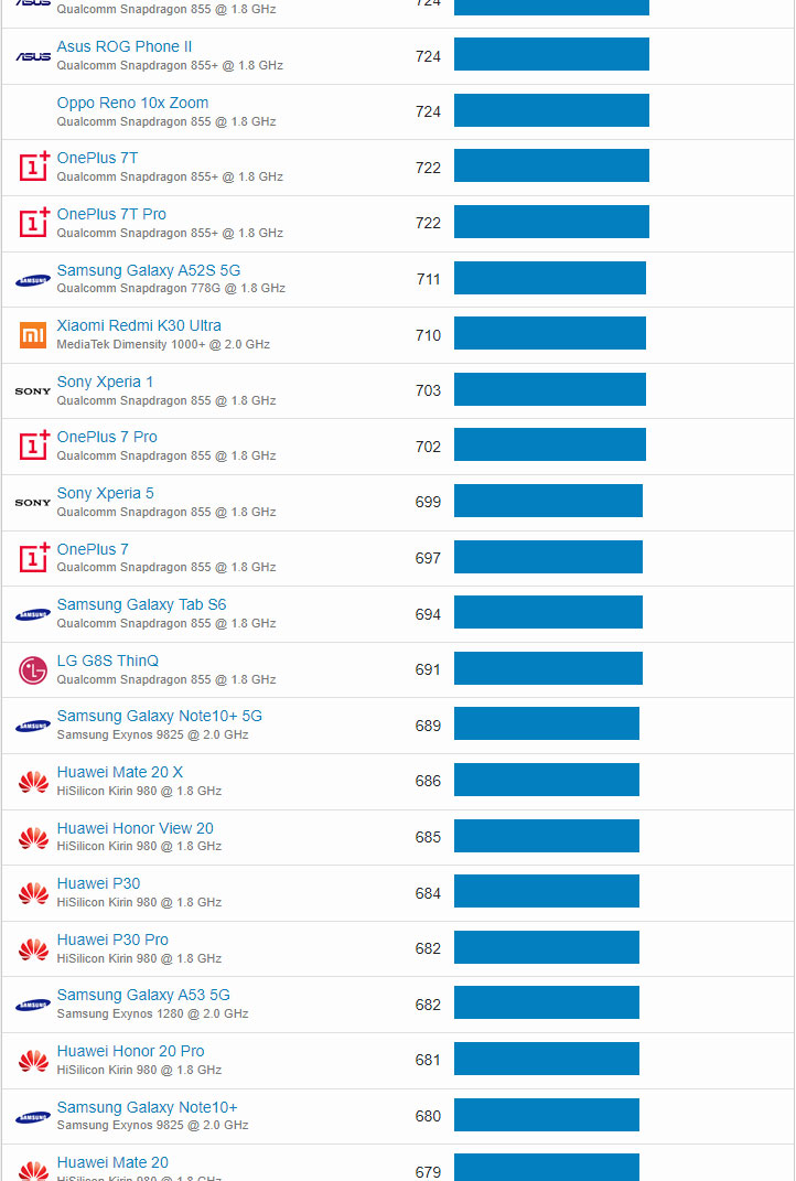 | 82 | OnePlus 7T Pro 5G | Qualcomm Snapdragon 855+ @ 1.8 GHz | 728 |