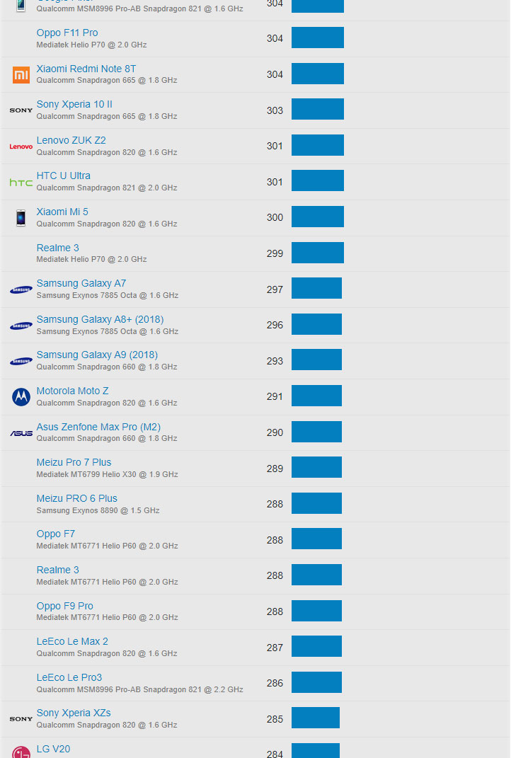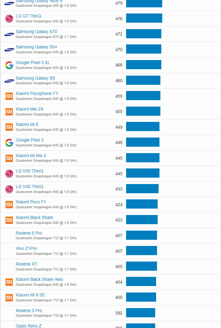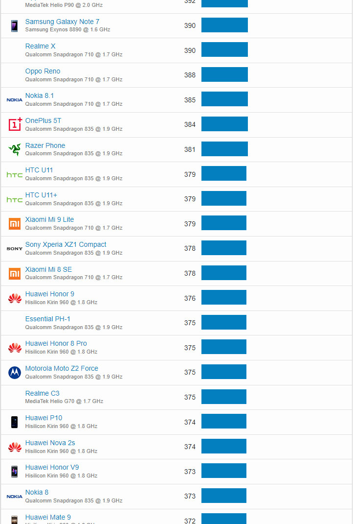 | 85 | Oppo Reno 10x Zoom | Qualcomm Snapdragon 855 @ 1.8 GHz | 724 |