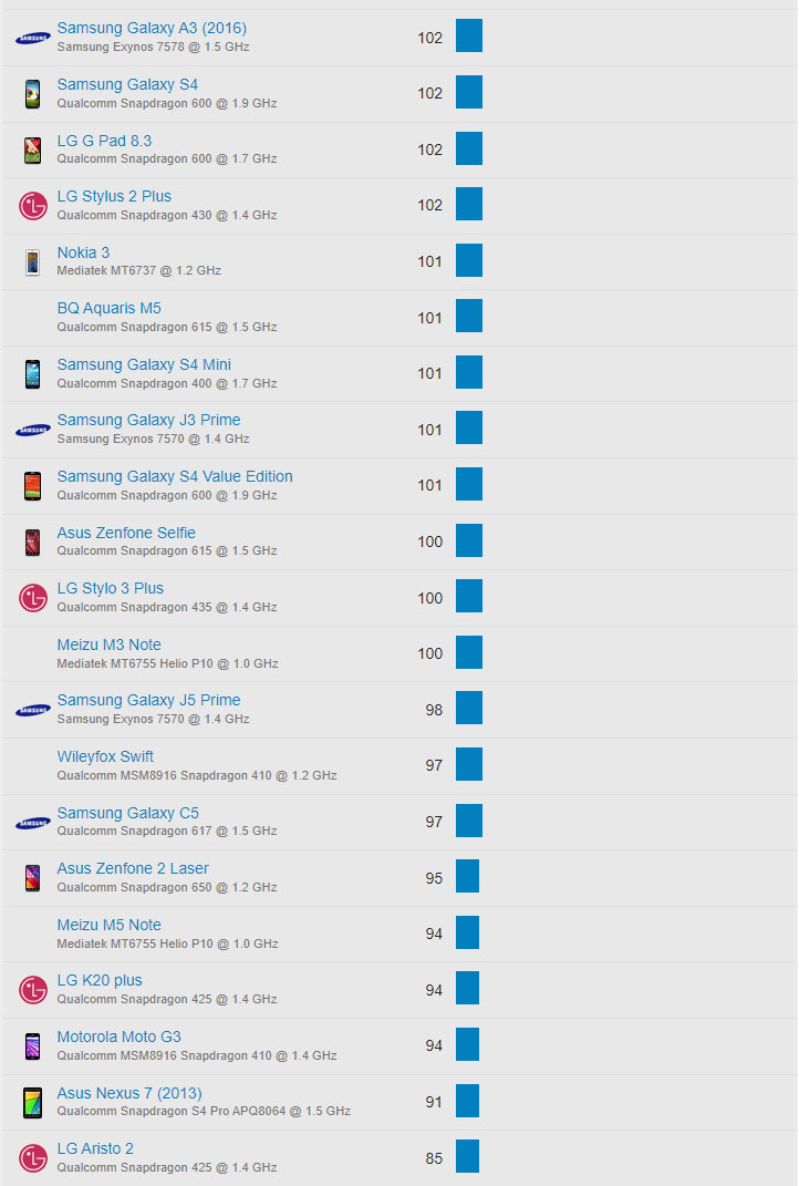 | 652 | LG Stylus 3 | Mediatek MT6750 @ 1.4 GHz | 103 |