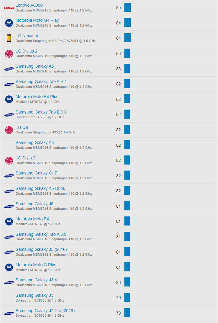 | 692 | Samsung Galaxy J5 (2016) | Qualcomm MSM8916 Snapdragon 410 @ 1.2 GHz | 81 |