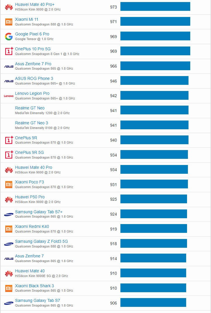 | 38 | Huawei Mate 40 | HiSilicon Kirin 9000E 5G @ 2.0 GHz | 910 |
