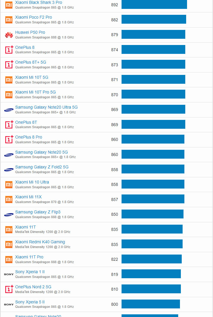 | 16 | Xiaomi Black Shark 4 | Qualcomm Snapdragon 870 @ 1.8 GHz | 978 |