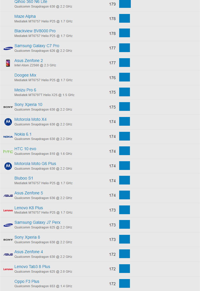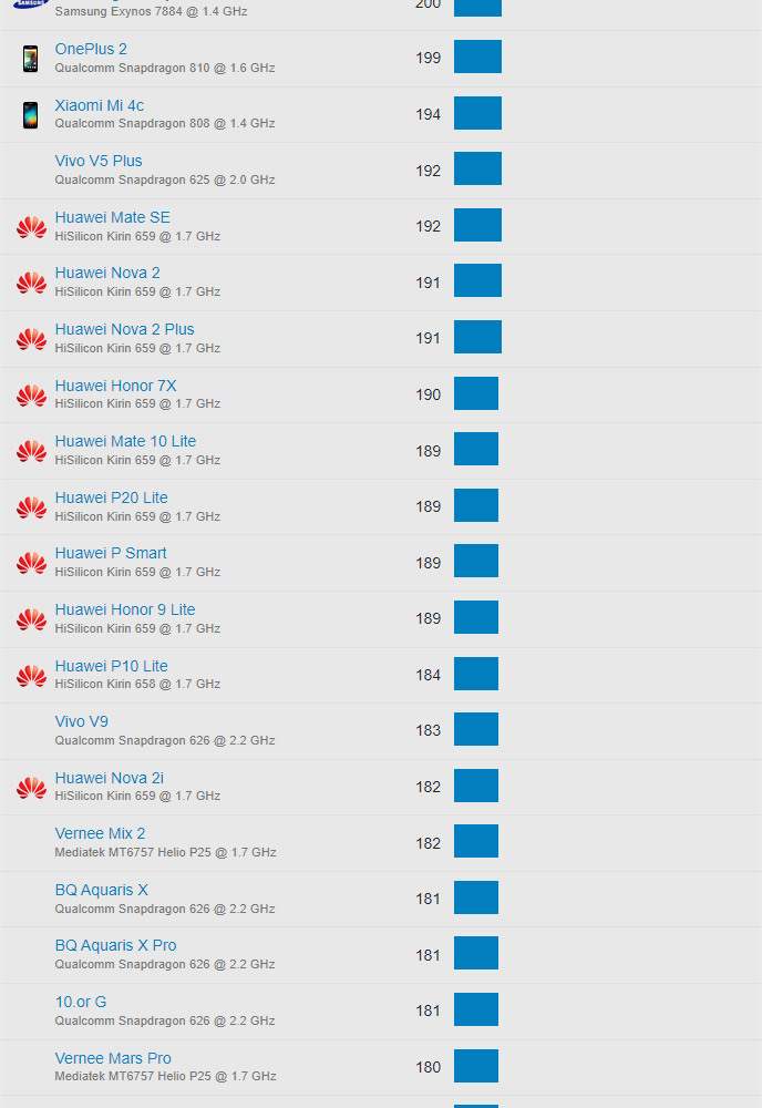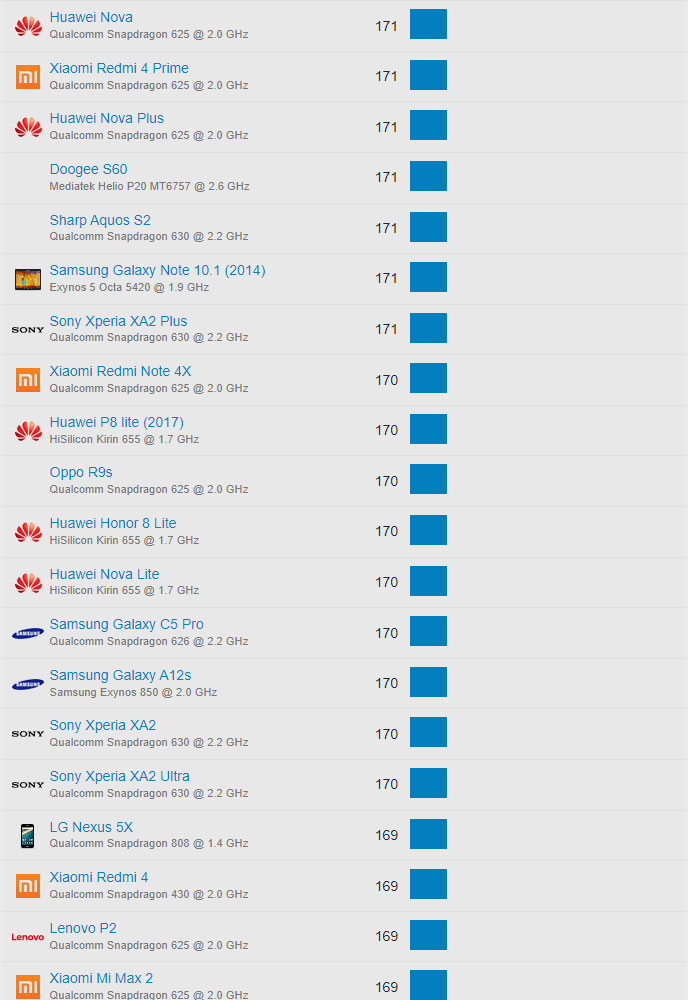 | 644 | Huawei Honor 6A | Qualcomm Snapdragon 430 @ 1.4 GHz | 105 |