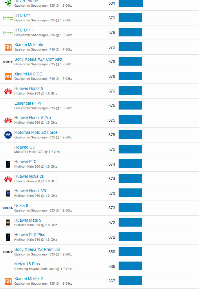 | 84 | Asus ROG Phone II | Qualcomm Snapdragon 855+ @ 1.8 GHz | 724 |