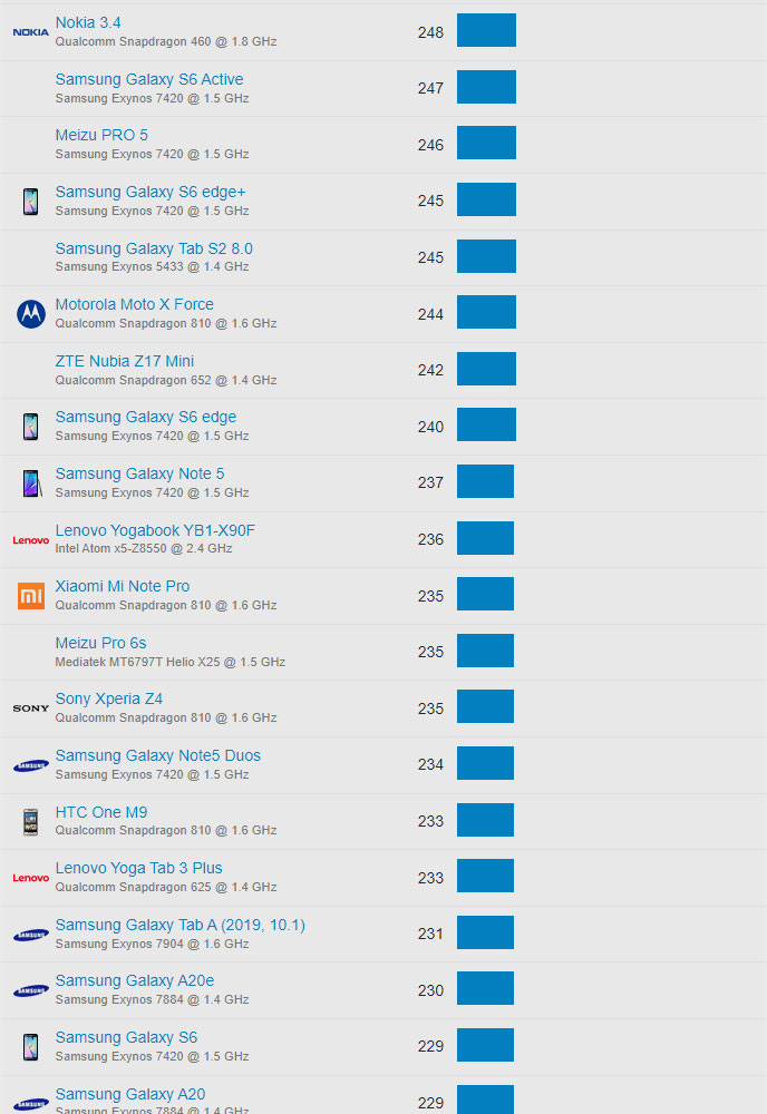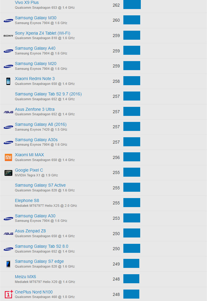 | 34 | Samsung Galaxy Tab S7+ | Qualcomm Snapdragon 865 @ 1.8 GHz | 924 |