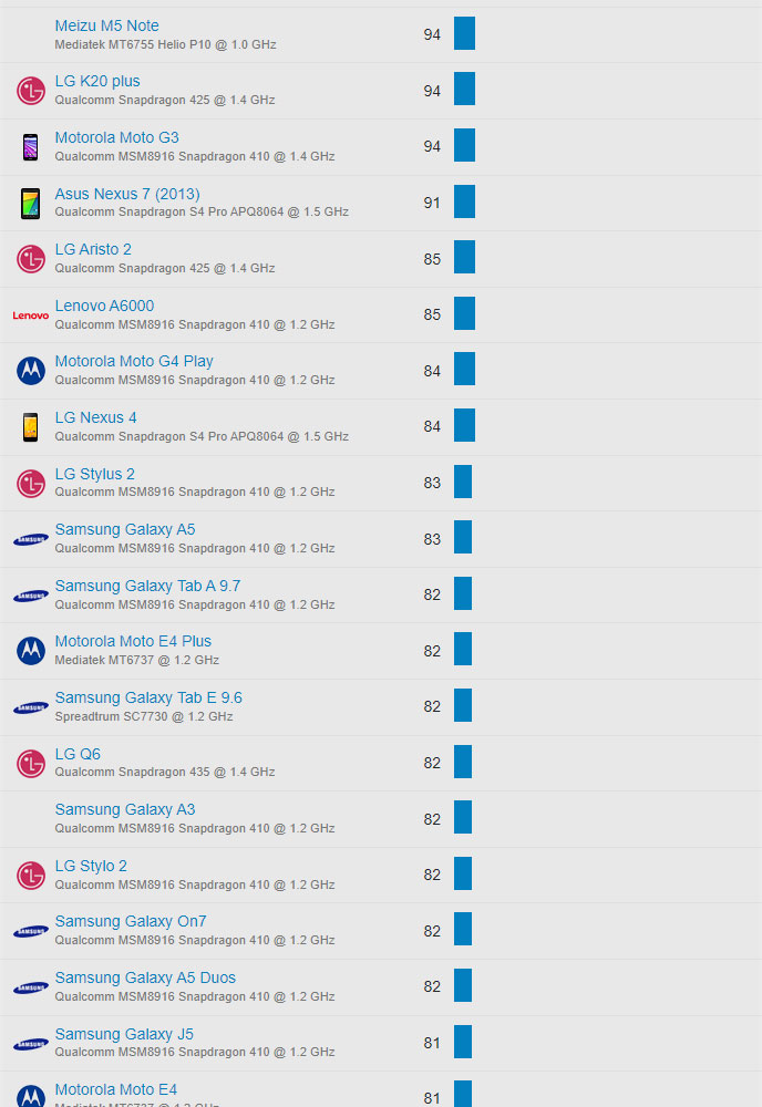 | 672 | LG K20 plus | Qualcomm Snapdragon 425 @ 1.4 GHz | 94 |