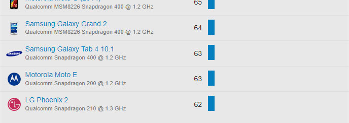 | 713 | Motorola Moto E | Qualcomm Snapdragon 200 @ 1.2 GHz | 63 |