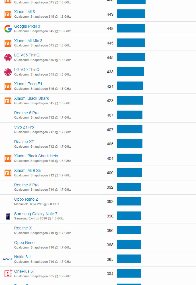 | 85 | Oppo Reno 10x Zoom | Qualcomm Snapdragon 855 @ 1.8 GHz | 724 |