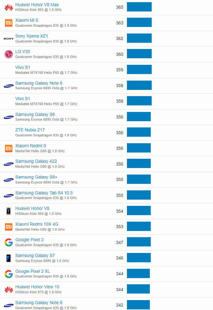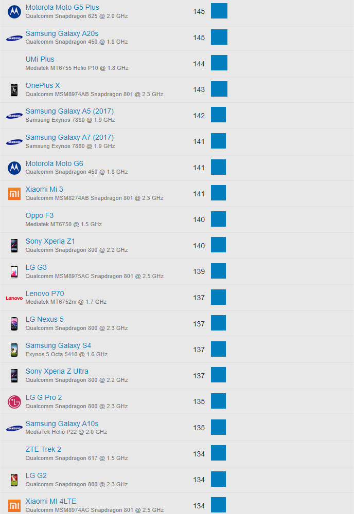 | 641 | Motorola Moto G5S | Qualcomm Snapdragon 430 @ 1.4 GHz | 105 |