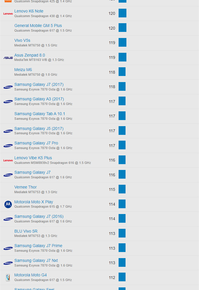 | 626 | Samsung Galaxy J7 (2016) | Qualcomm Snapdragon 617 @ 1.6 GHz | 114 |