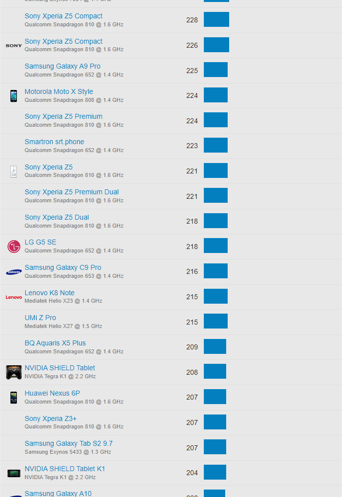 | 677 | Motorola Moto G4 Play | Qualcomm MSM8916 Snapdragon 410 @ 1.2 GHz | 84 |