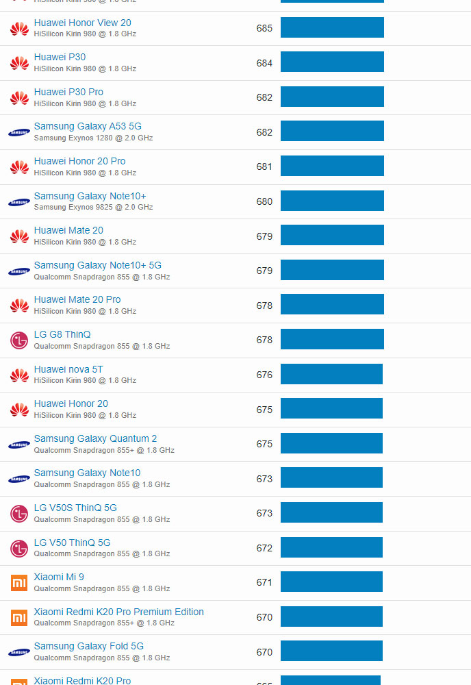 | 70 | Huawei Honor V30 Pro | HiSilicon Kirin 990 @ 2.0 GHz | 757 |