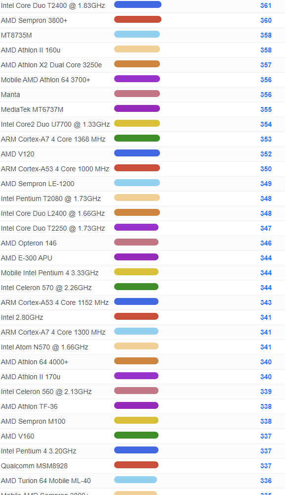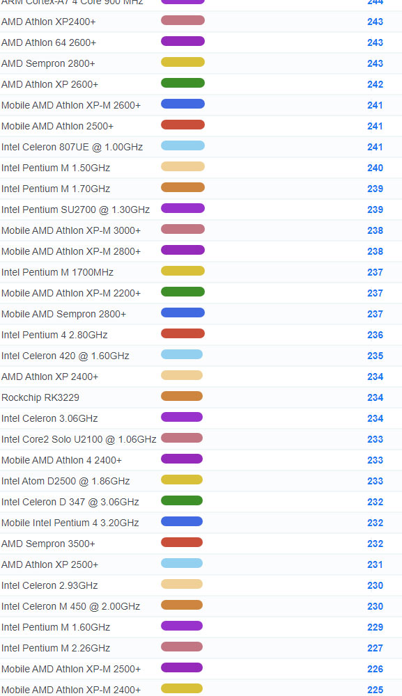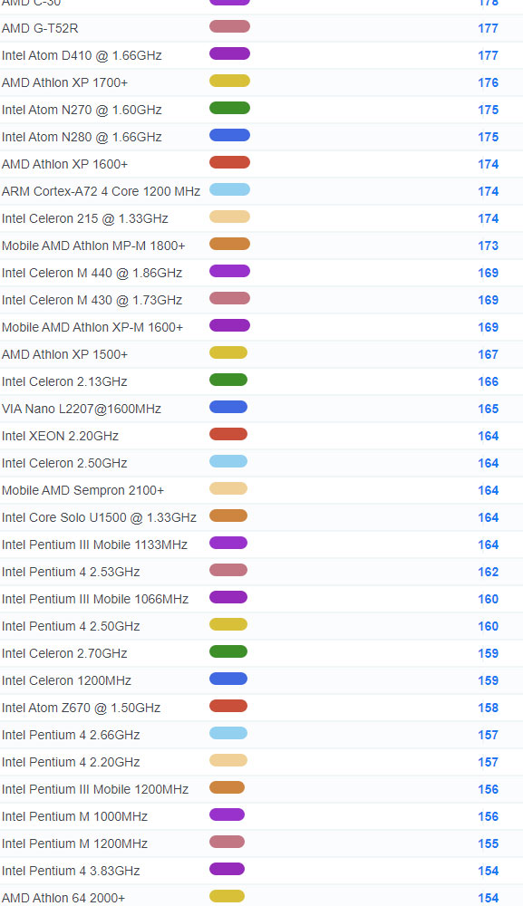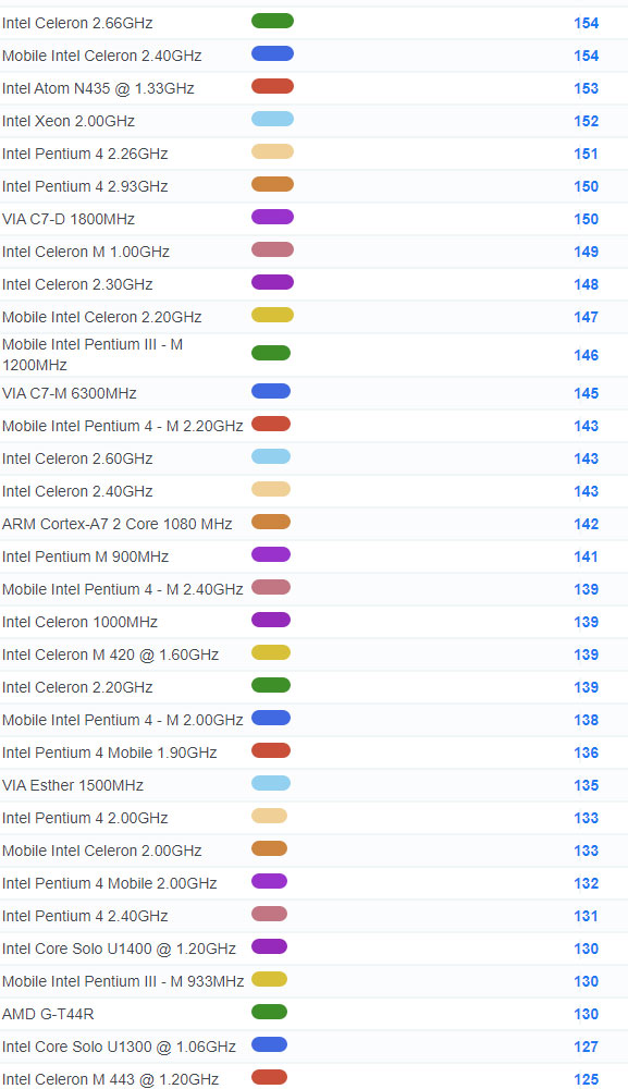 | 4004 | Intel Core Solo U1300 @ 1.06GHz | 127 |