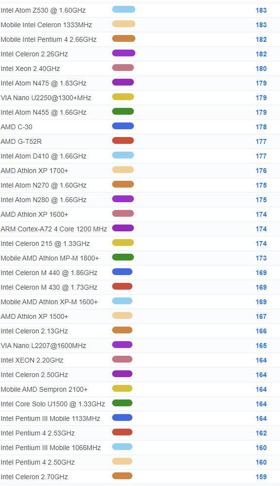 | 4040 | Intel Core Solo U1300 @ 1.06GHz | 127 |