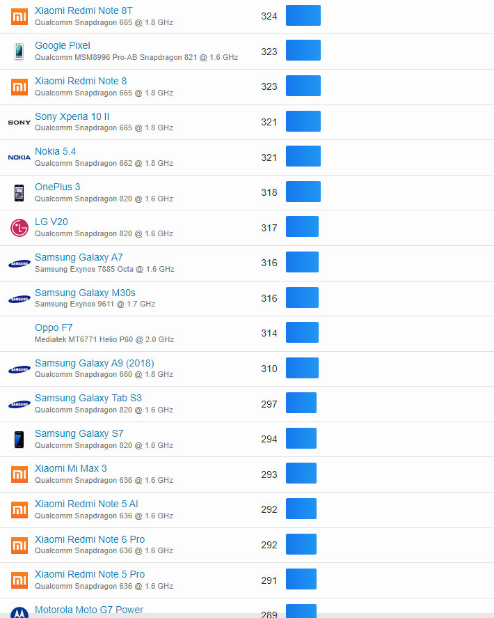 | 297 | Xiaomi Redmi Note 8T | Qualcomm Snapdragon 665 @ 1.8 GHz | 324 |