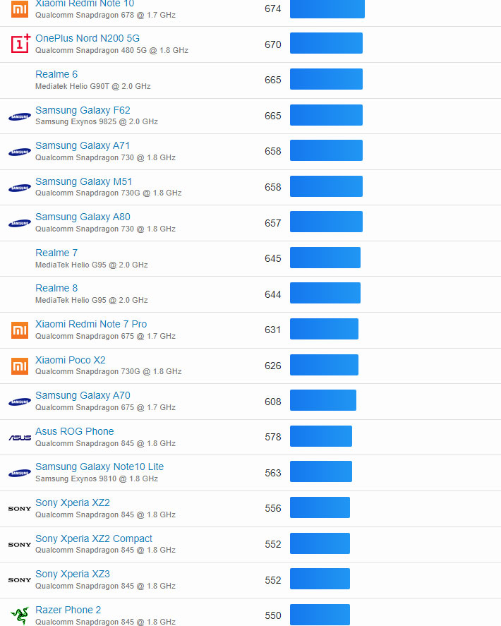 | 300 | Sony Xperia 10 II | Qualcomm Snapdragon 665 @ 1.8 GHz | 321 |