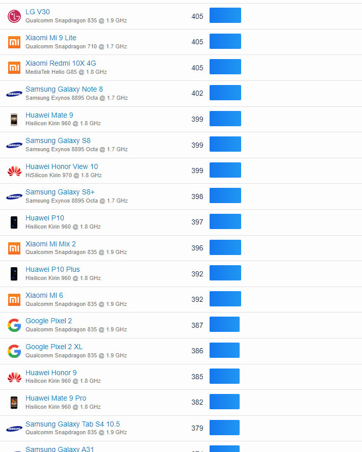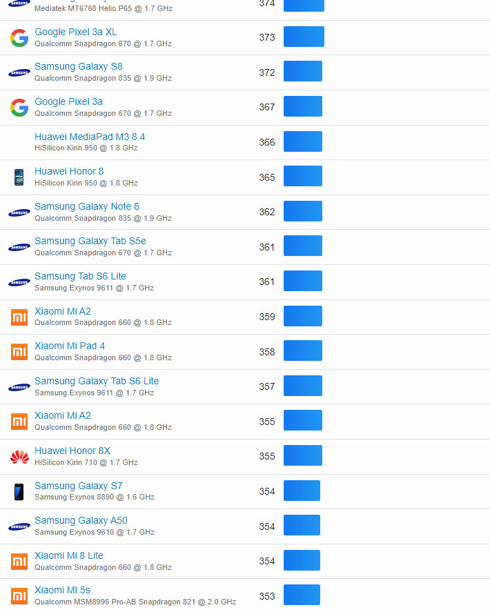 | 336 | Xiaomi Mi A1 | Qualcomm Snapdragon 625 @ 2.0 GHz | 191 |