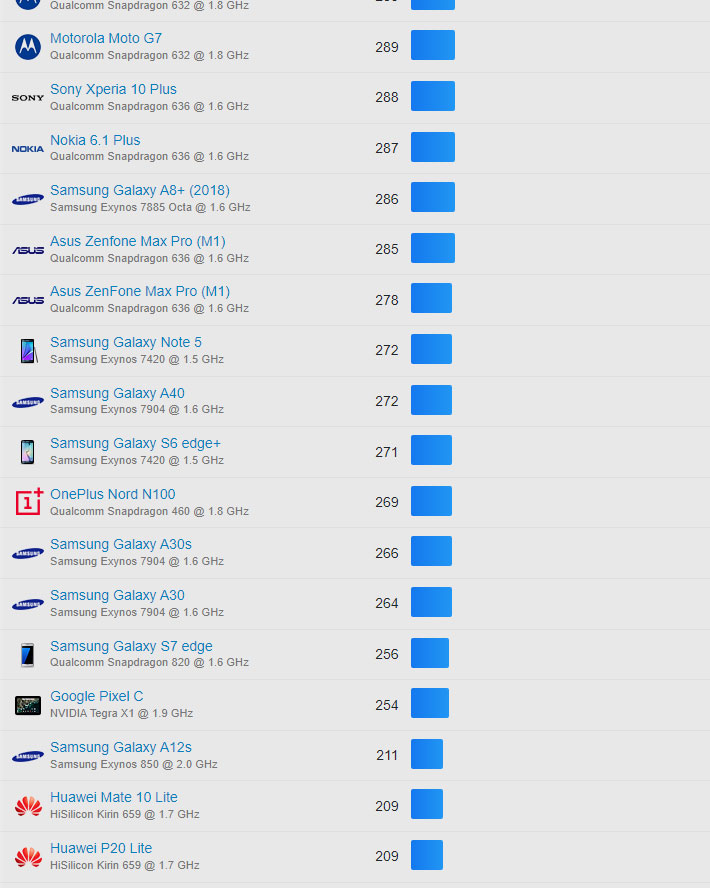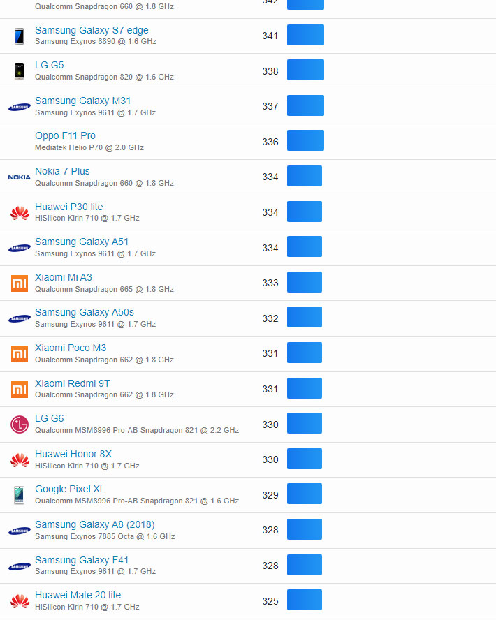 | 325 | Samsung Galaxy A30s | Samsung Exynos 7904 @ 1.6 GHz | 266 |