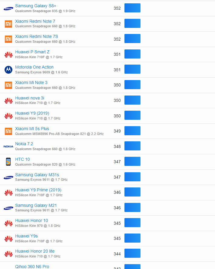 | 265 | Huawei P Smart Z | HiSilicon Kirin 710F @ 1.7 GHz | 351 |