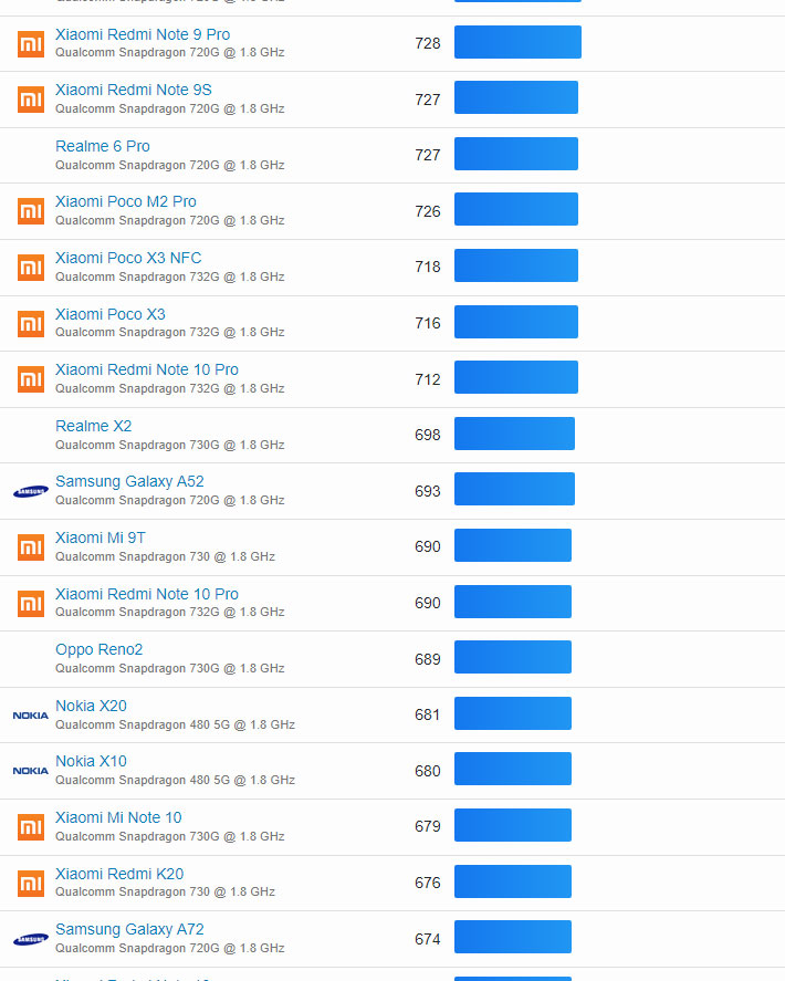 | 271 | Nokia 7.2 | Qualcomm Snapdragon 660 @ 1.8 GHz | 348 |