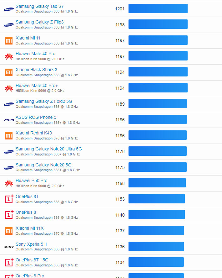 | 37 | Huawei Mate 40 Pro | HiSilicon Kirin 9000 @ 2.0 GHz | 1197 |