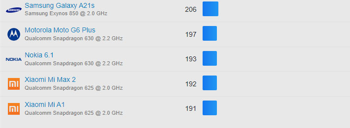 | 332 | Samsung Galaxy A21s | Samsung Exynos 850 @ 2.0 GHz | 206 |