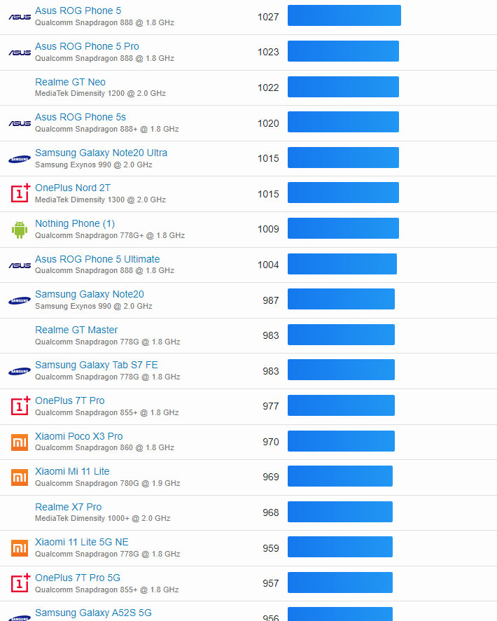 | 29 | OnePlus 9R 5G | Qualcomm Snapdragon 870 @ 1.8 GHz | 1232 |