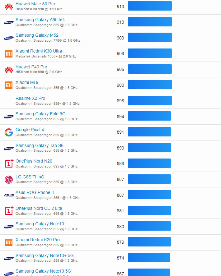 | 56 | Huawei Mate 40 | HiSilicon Kirin 9000E 5G @ 2.0 GHz | 1107 |