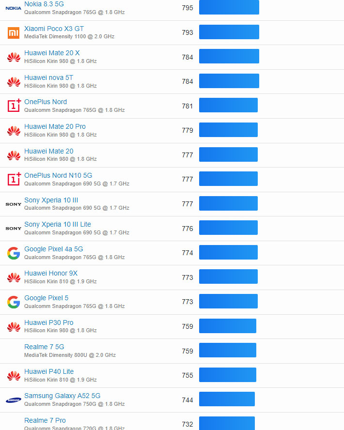 | 301 | Nokia 5.4 | Qualcomm Snapdragon 662 @ 1.8 GHz | 321 |