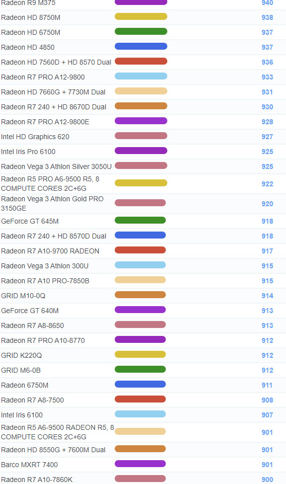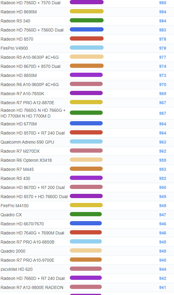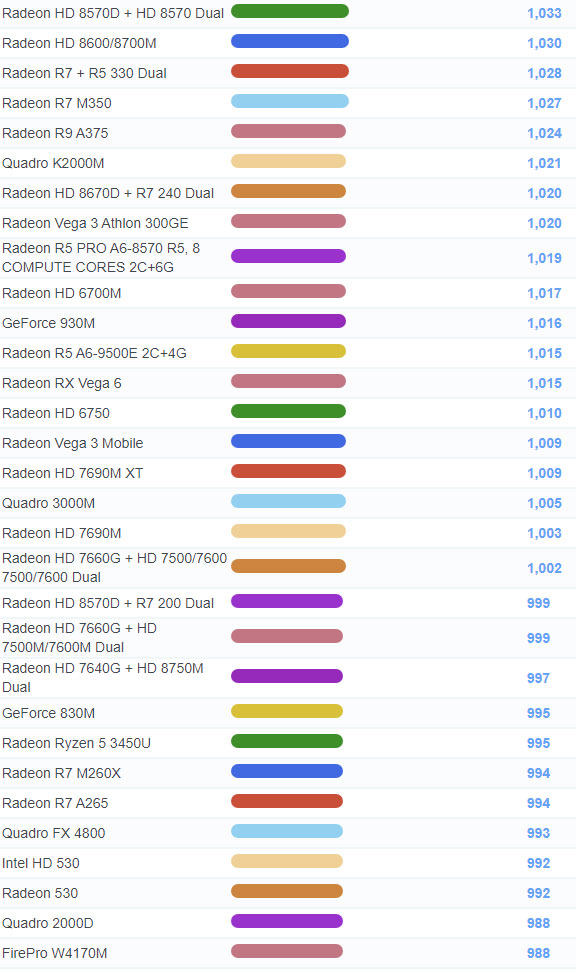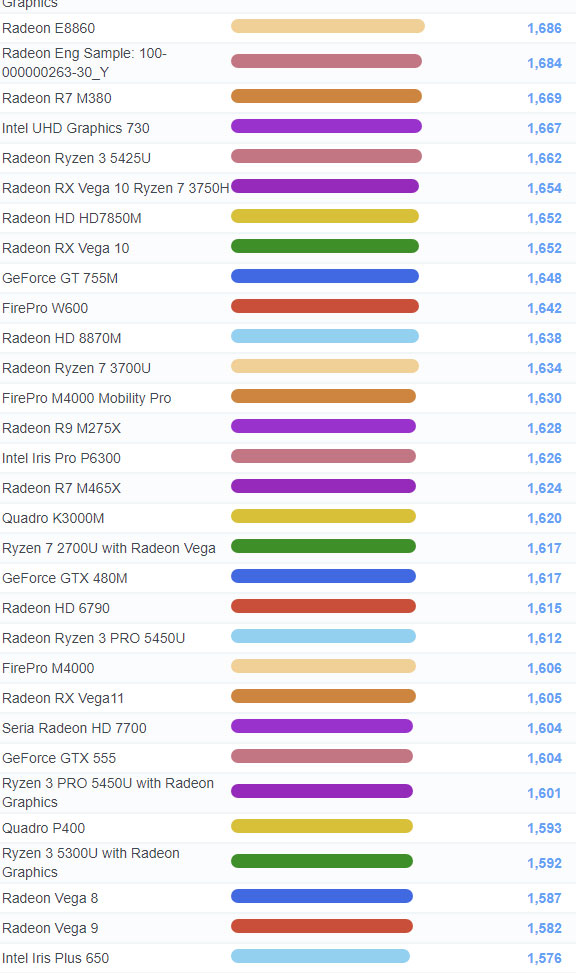 | 1205 | Radeon Vega 3 Ryzen Embedded R1505G | 746 |