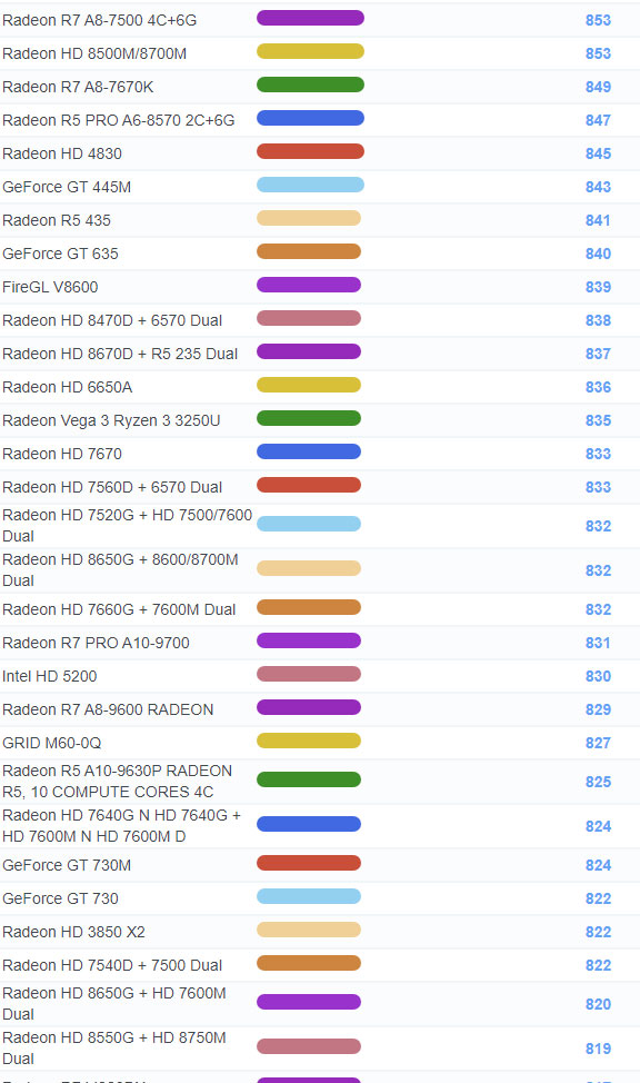 | 1175 | Radeon HD 8650G N HD 8650G + HD 8570M Dual | 773 |