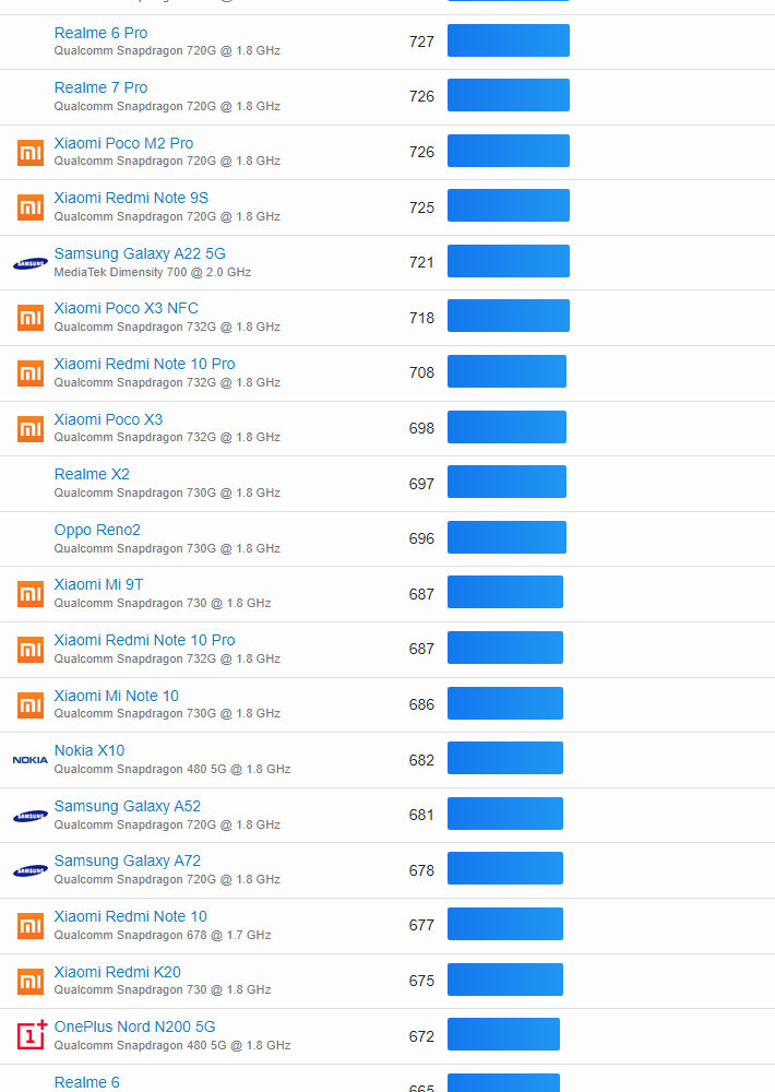 | 328 | Nokia 5.3 | Qualcomm Snapdragon 665 @ 1.8 GHz | 328 |