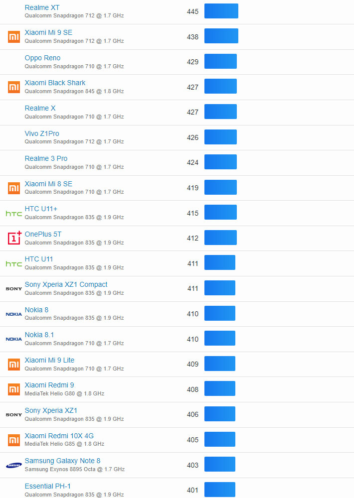 | 393 | Xiaomi Mi A1 | Qualcomm Snapdragon 625 @ 2.0 GHz | 191 |