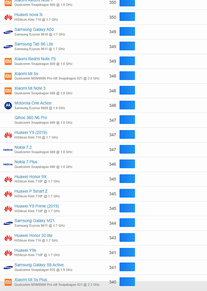 | 308 | Huawei P Smart Z | HiSilicon Kirin 710F @ 1.7 GHz | 345 |