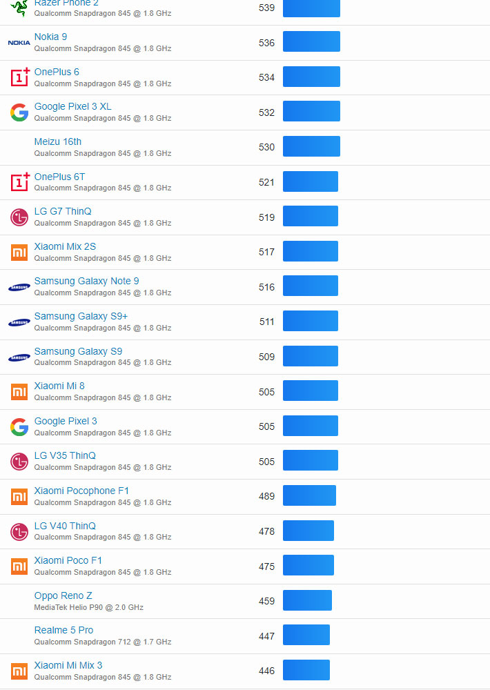 | 390 | Motorola Moto G6 Plus | Qualcomm Snapdragon 630 @ 2.2 GHz | 196 |