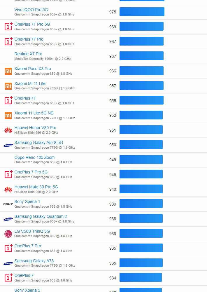 | 62 | OnePlus 8T+ 5G | Qualcomm Snapdragon 865 @ 1.8 GHz | 1151 |