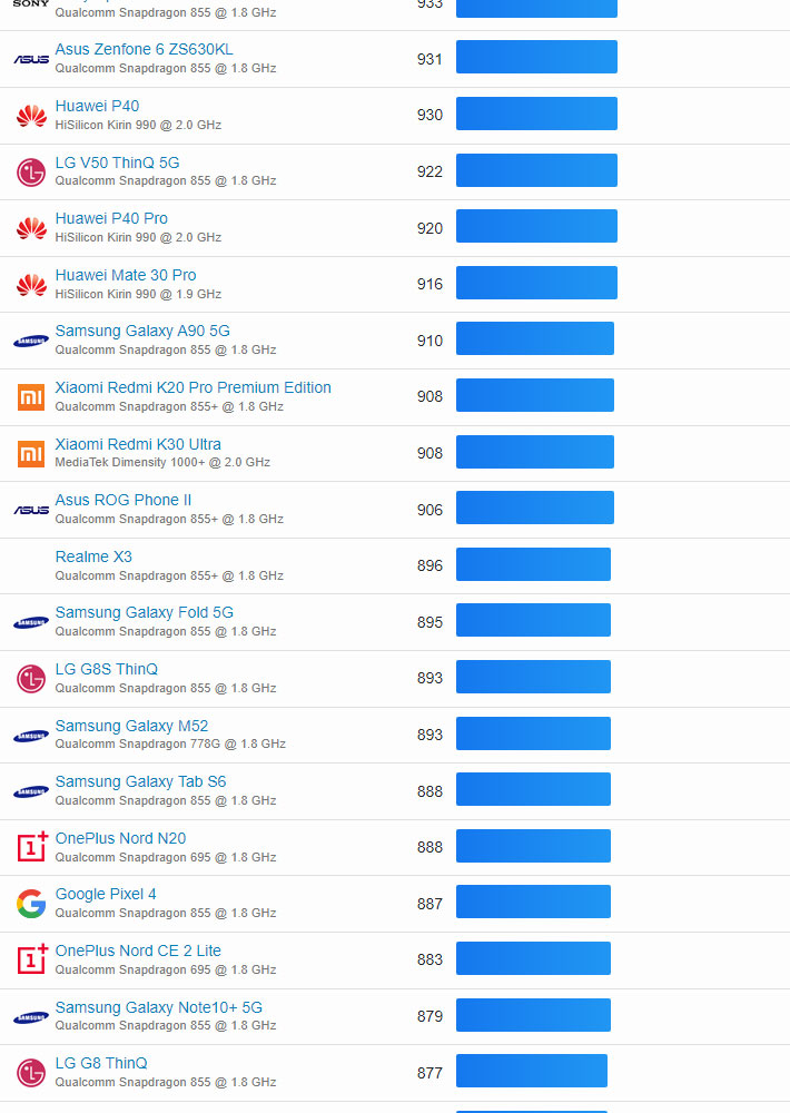 | 58 | Samsung Galaxy Z Fold2 5G | Qualcomm Snapdragon 865 @ 1.8 GHz | 1163 |
