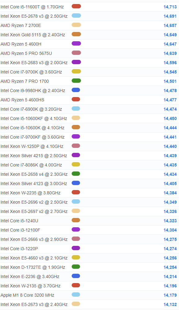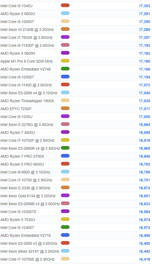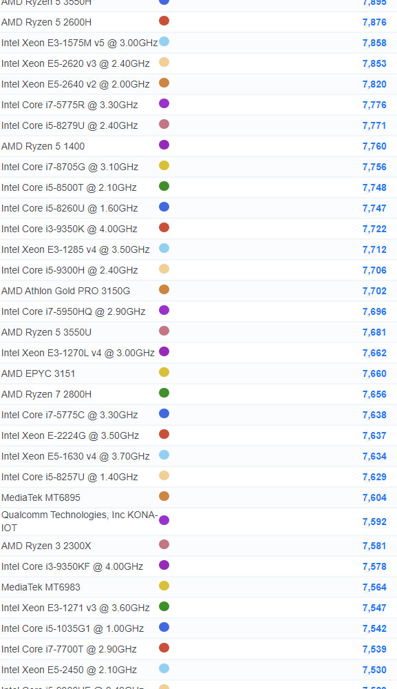 | 990 | Intel Core i5-8279U @ 2.40GHz | 7,771 |