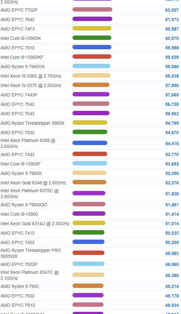 | 62 | Intel Xeon W-3345 @ 3.00GHz | 48,261 |