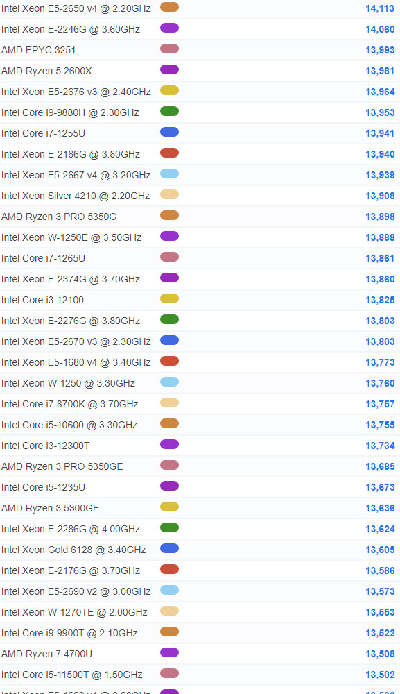 | 950 | Intel Core i3-10100E @ 3.20GHz | 8,229 |